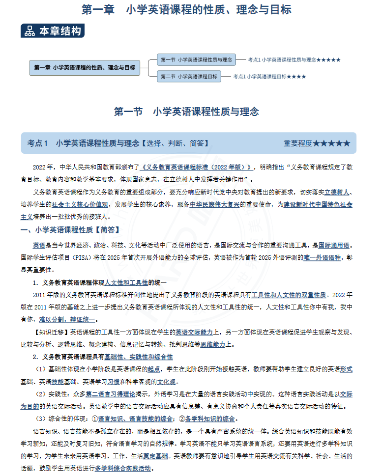 一、夯实基础理论,构建核心框架。以考试指定教材和《义务教育英语课程标准》为核心,搭建“理论体系—课型逻辑—素养导向”三维知识网络:1. 框架梳理模块:按章节脉络(教学研究概述、英语核心素养培养、听说读写课型研究、学情分析、教学评价、教研方法等)梳理,明确小学英语教学研究的核心逻辑;2. 核心强化模块:吃透核心理论(建构主义学习理论、任务型教学理论)、关键概念(任务型教学、情境教学、绘本教学、校本教研等)及各课型教学原则;3. 基础巩固模块:结合章节练习强化记忆,梳理“理论—课型实践—素养落地”的对应关系,确保基础知识点与核心术语无遗漏。