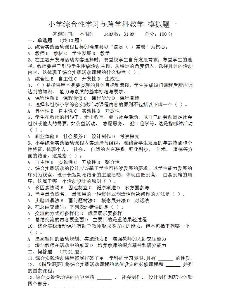 一、夯实基础理论,构建核心框架。以考试指定教材和《中小学综合实践活动课程指导纲要》为核心,搭建“理论体系—融合逻辑—地域适配”三维知识网络:1. 框架梳理模块:按章节脉络(综合性学习概述、跨学科融合原则与模式、主题设计、实施流程、评价方式等)梳理,明确核心理论(如核心素养导向融合理论、项目式学习理论)与融合模式(主题式、项目驱动式);2. 核心强化模块:吃透关键概念(跨学科整合、主题探究、创意物化等),掌握六省共性要求与地域特色方向(如新疆民族文化融合、山东传统文化、江苏科技实践等地域素材适配);3. 基础巩固模块:结合章节练习强化记忆,梳理“理论—融合模式—地域素材”的对应关系,确保基础知识点无遗漏。
