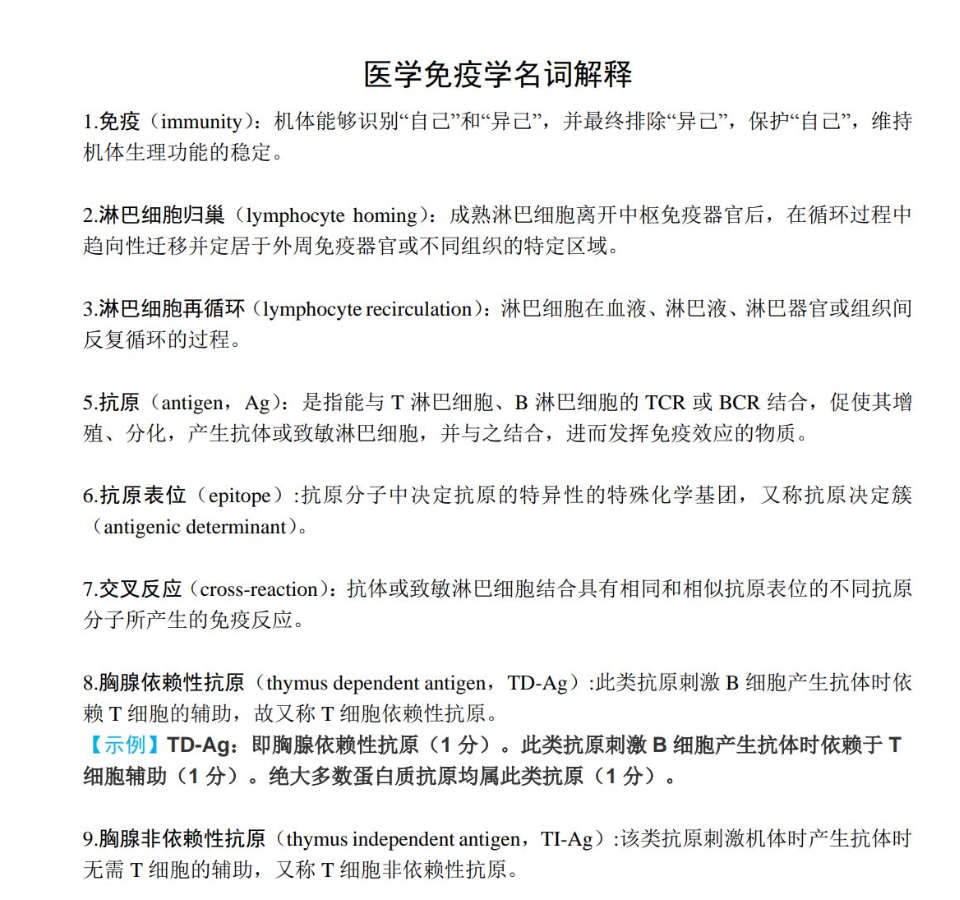 最后,真题和名词解释是“保命符”。免疫学的名词特别多(细胞因子、补体、MHC),必须精准默写,一字不差。建议把容易混淆的概念列成对比表(如IL-2 vs IL-4的功能),考前只看这个。