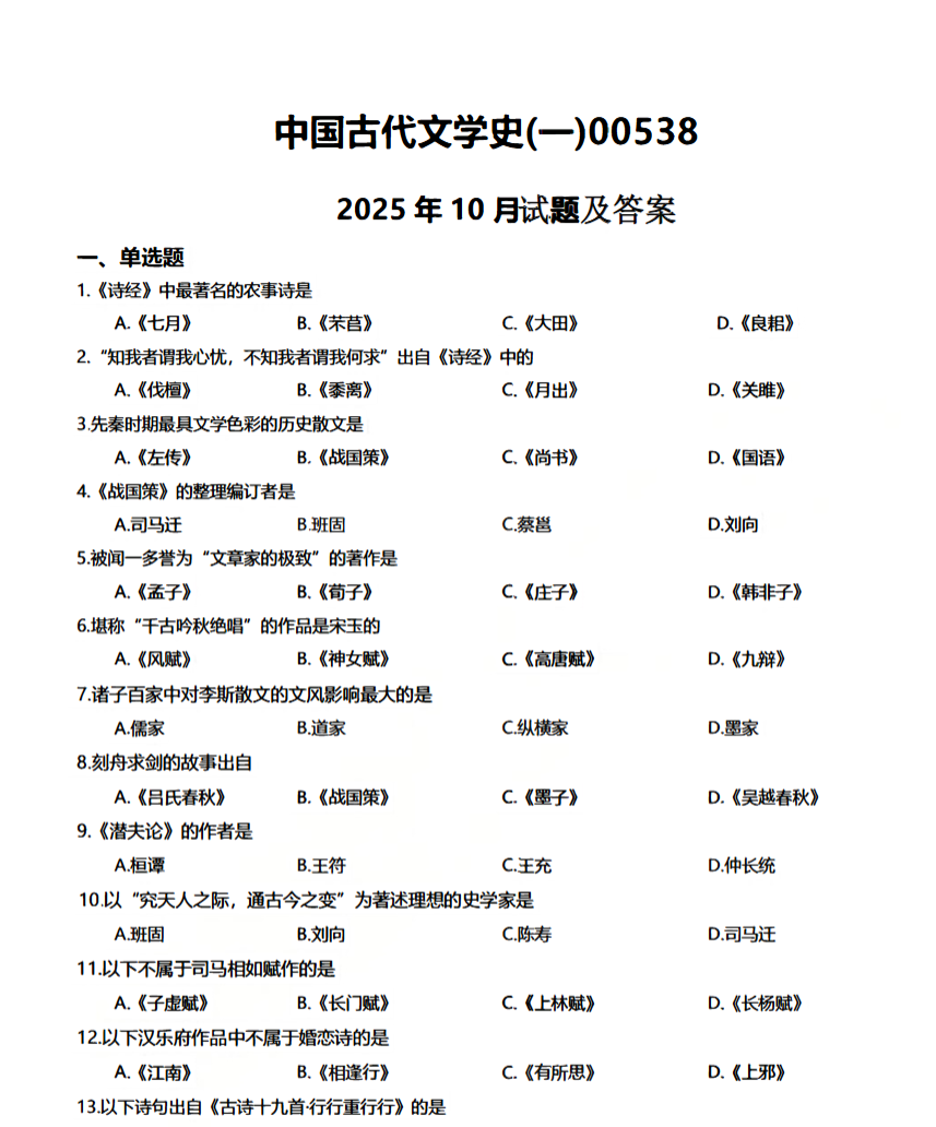 00538《中国古代文学史一》备考核心是梳理先秦至隋唐的文学发展脉络,掌握各时期核心流派、代表作家及经典作品精髓,紧扣“脉络清晰+识记扎实+赏析精准”的备考要求,聚焦文学脉络、流派作家、作品解读三大核心模块,通过“夯实基础—考点突破—实战演练”的节奏,实现知识积累与文学分析能力的同步提升。该科目侧重考查早期文学阶段特征、文体演变、作家生平与代表作、作品主旨及艺术手法等内容,兼顾识记、理解与鉴赏能力,具体建议如下: