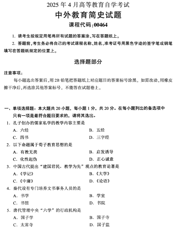 00464《中外教育简史》备考核心是梳理中外教育发展脉络,掌握核心教育家、教育制度及教育思想的演变逻辑,紧扣“脉络清晰+识记扎实+关联精准”的备考要求,聚焦历史脉络、核心要素、中外关联三大核心模块,通过“夯实基础—考点突破—实战演练”的节奏,实现知识积累与教育历史问题分析能力的同步提升。该科目侧重考查教育发展阶段特征、教育家核心思想、教育制度演变、中外教育对比等内容,兼顾识记、理解与关联分析能力,具体建议如下: