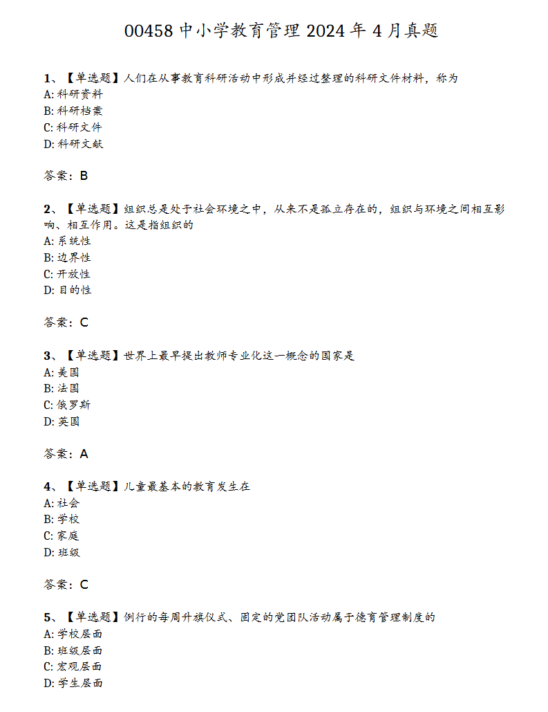 00458《中小学教育管理》备考核心是掌握中小学教育管理的基本原理、核心职能与实践操作逻辑,紧扣“理论扎实+职能清晰+实践适配”的备考要求,聚焦理论基础、管理职能、实践应用三大核心模块,通过“夯实基础—考点突破—实战演练”的节奏,实现理论记忆与中小学教育管理实践分析能力的同步提升。该科目侧重考查核心概念识记、管理理论应用、教育政策解读、管理方案设计等内容,兼顾识记、理解与实践管理能力,具体建议如下: